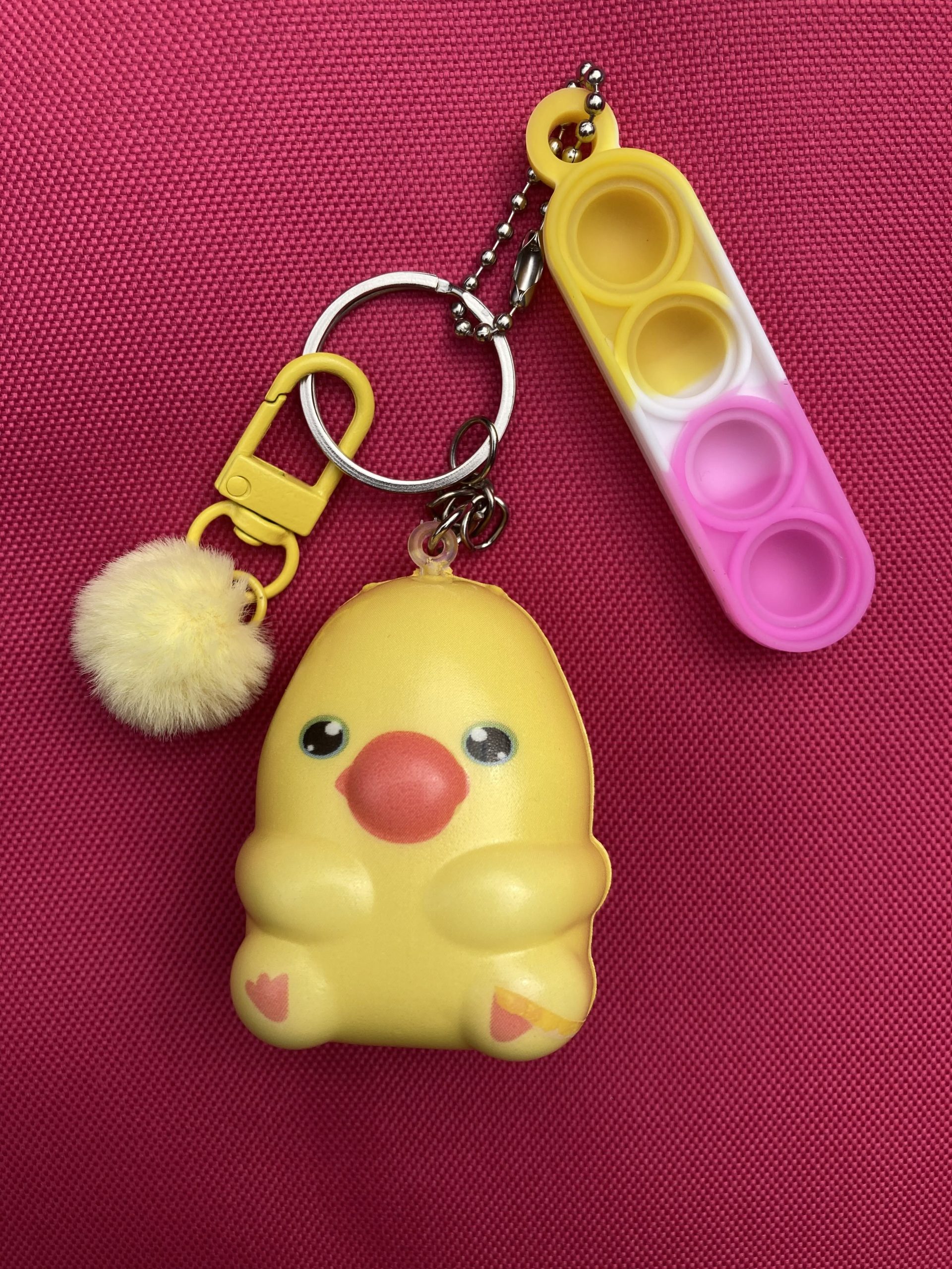 A fab little keychain set of fidgets that are colour colordinated. This one is yellow with a squishy yellow chick, a tiny hard furry ball and a yellow/pink popper.