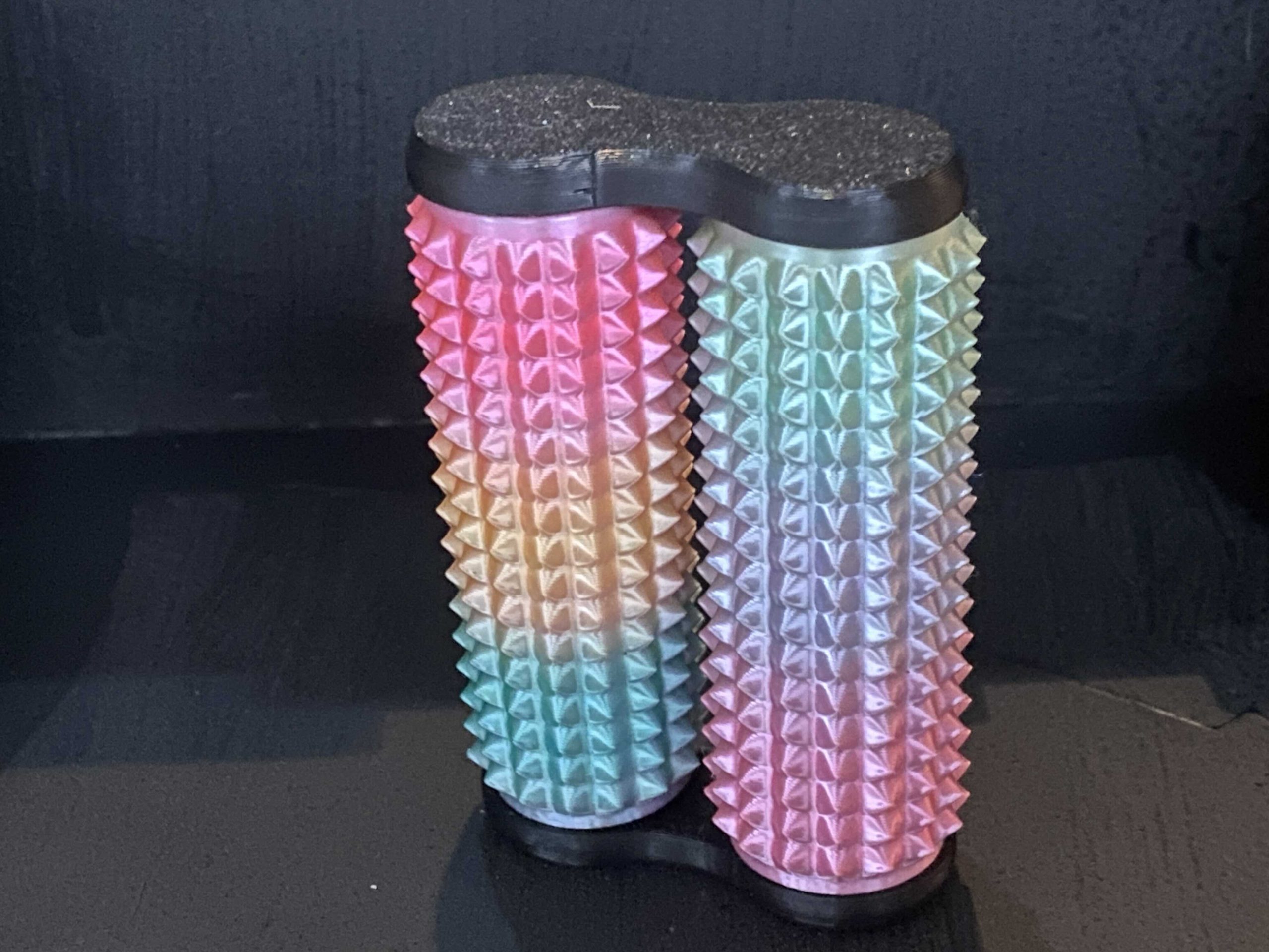 Double spiky roller pain stim in rainbow pastel colours. The spiky columns rotate independently. Made from durable 3D printed plastic. 7cm high.